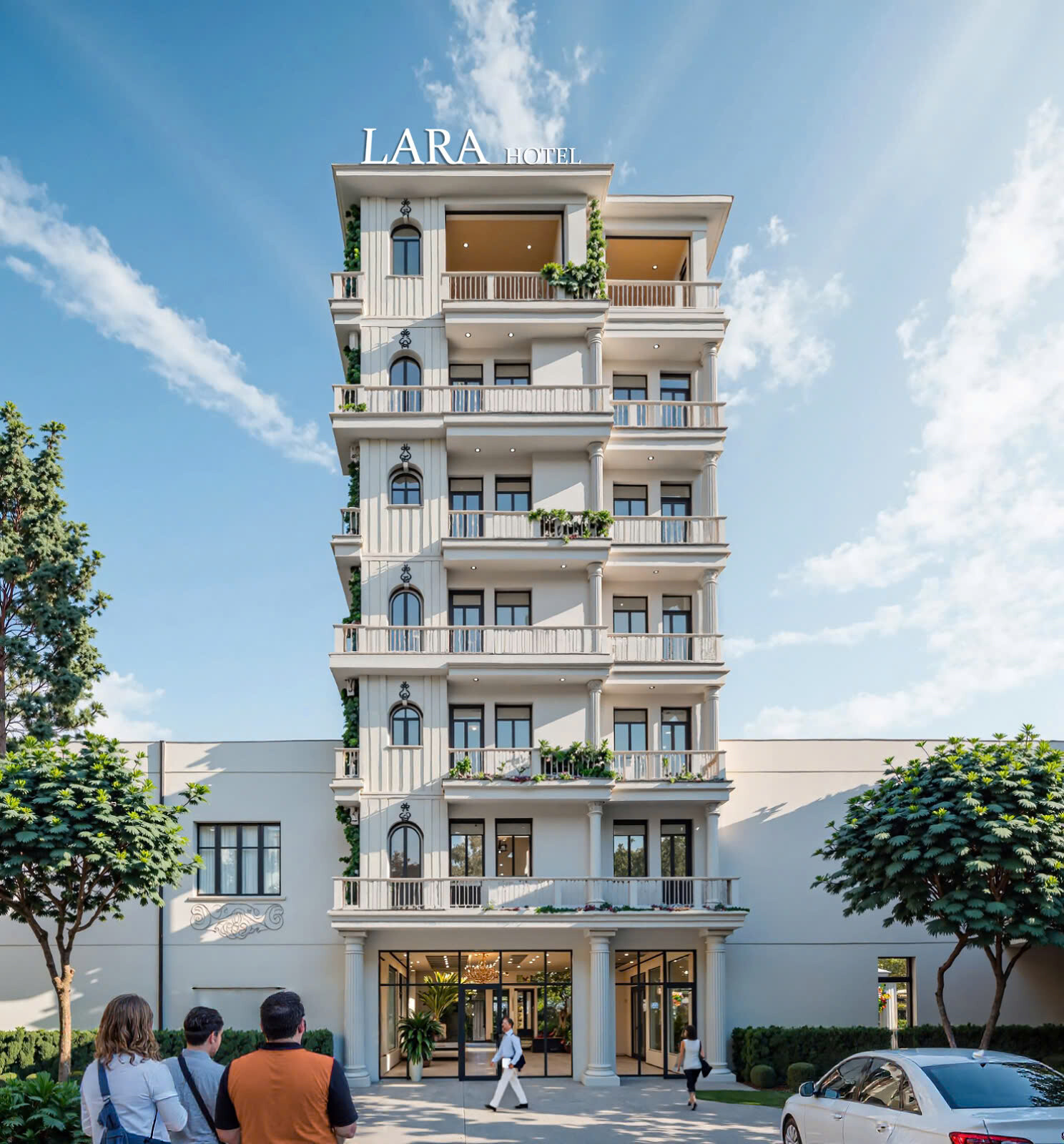 Mang phong cách Tân cổ điển_ sang trọng và chỉn chu, với thiết kế tinh tế. Công năng tối ưu cho khách sạn thành phố: mặt tiền thoáng sáng, không gian sảnh chờ tráng lệ và rộng giúp tăng sự thoải mái cho khách lưu trú. Nội thất được bố trí hợp lý, sử dụng vật liệu bền vững và dễ bảo trì, phù hợp vận hành lâu dài.